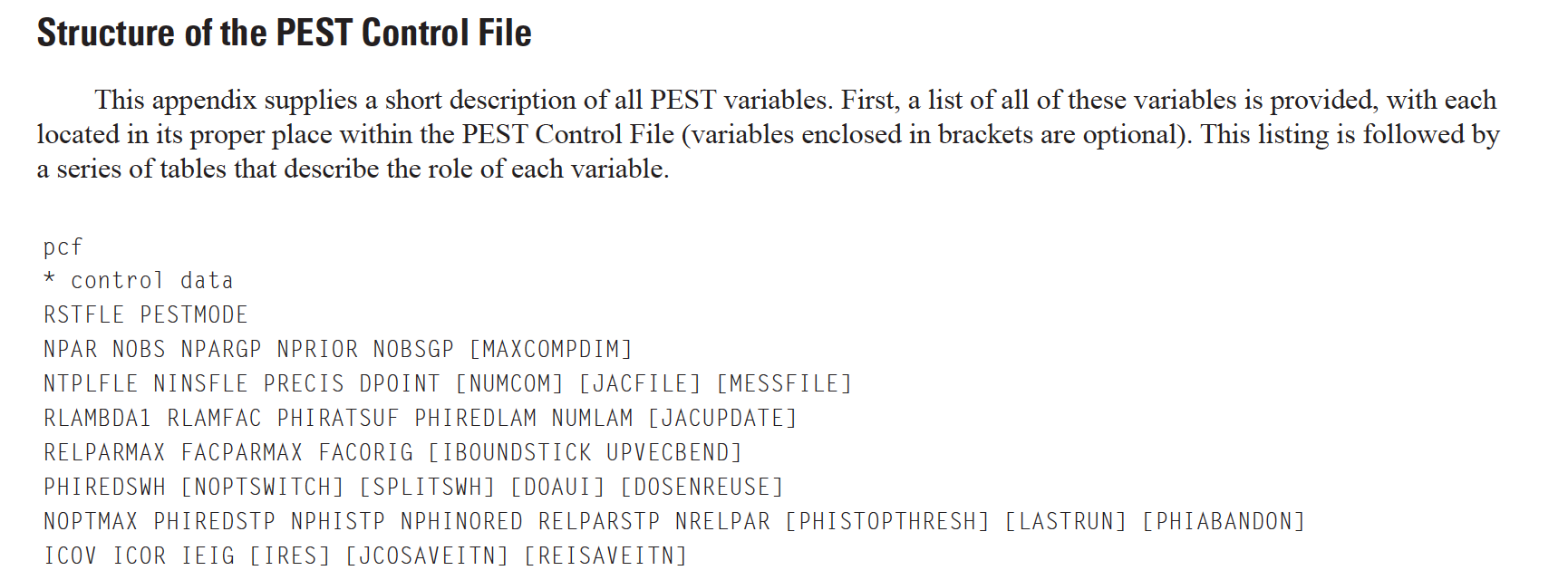 The control file is divided into sections. Each section of the PEST control file must begin with a single line of text comprising the header to that section. This line must begin with a “*” character followed by a space. The most commons sections which users are likely to access are: