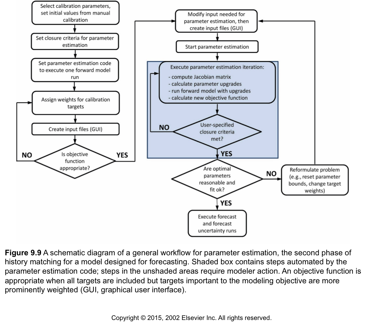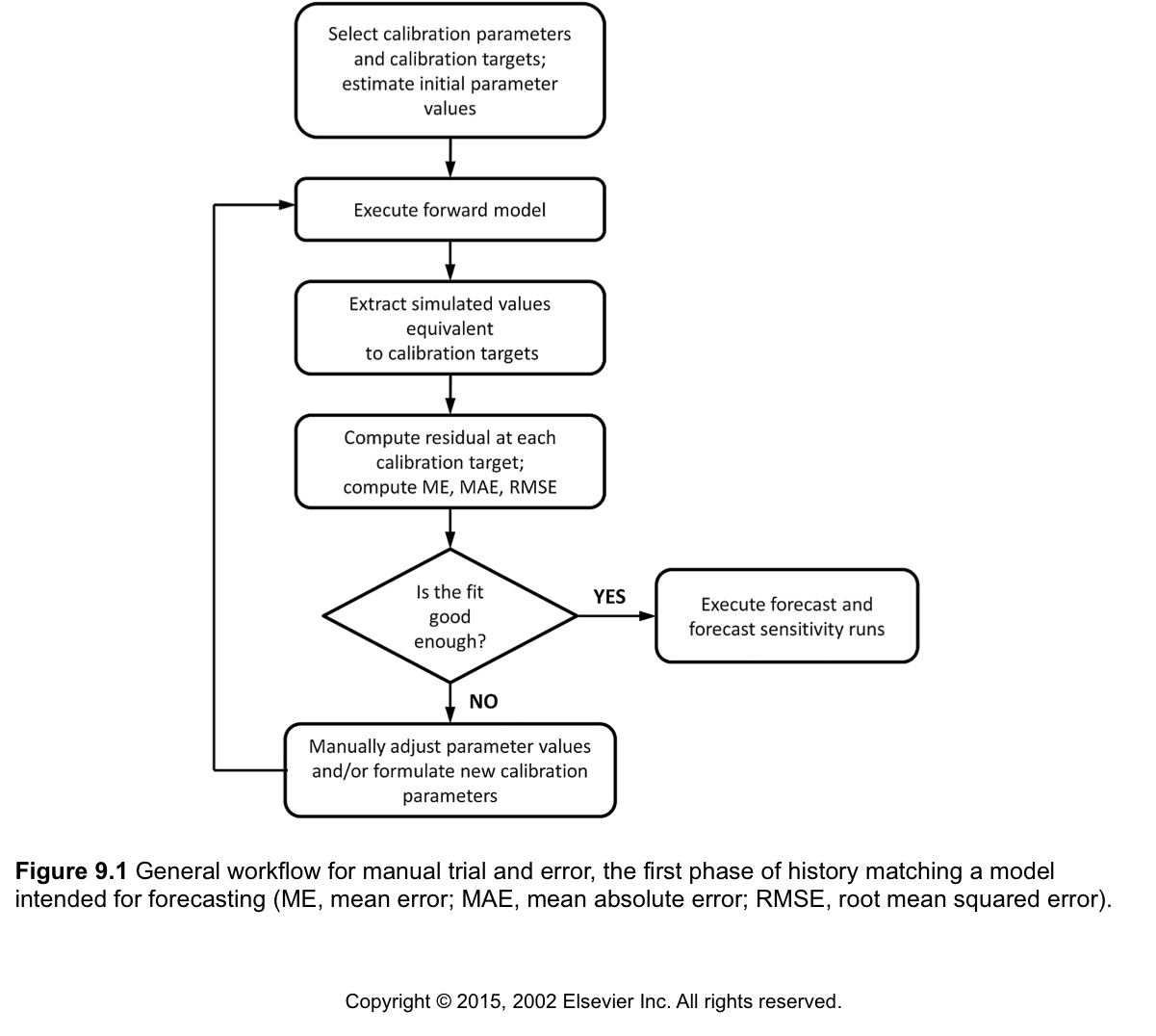 Here is a flow chart of manual trial-and-error history matching from Applied Groundwater Modeling (2nd edition) by Anderson et al. (2015):
