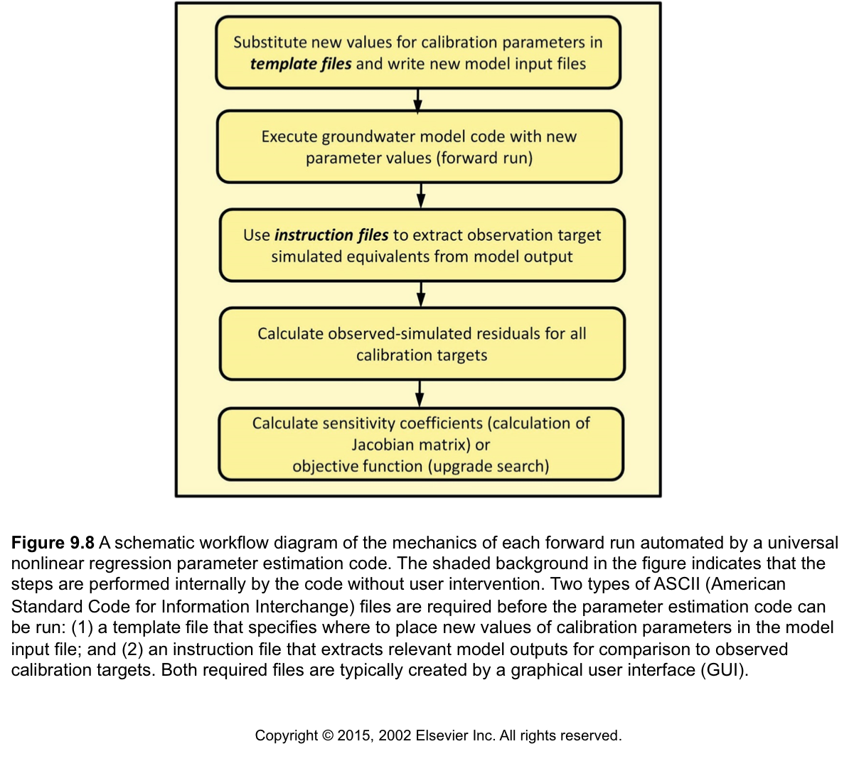 To be more specific, in the blue box in Figure 9.9 above there are certain steps that occur before and after each forward model run that PEST does. They exactly equate to what a manual trial-and-error calibration does, but PEST does it for you! Here are the steps that happen: